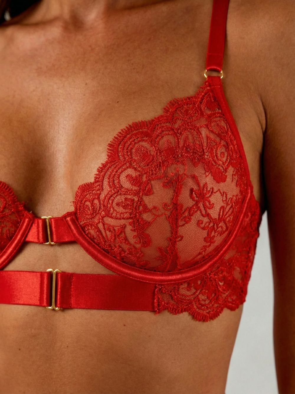 Rotes Spitzen-Set mit goldenen Schnallen und Harness-Elementen