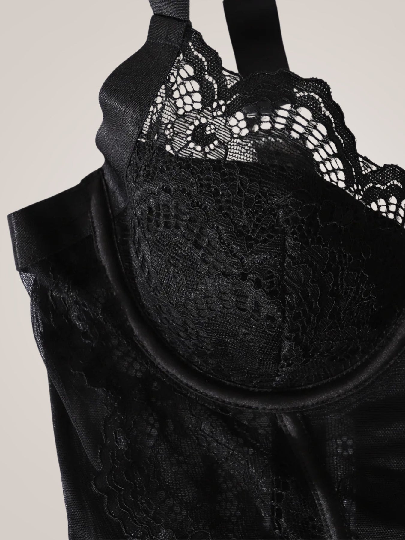 Feine schwarze Spitze trifft auf transparente Einsätze und formende Linien, die deine Silhouette betonen und deiner Haltung eine besondere Stärke verleihen. Die Corsage modelliert sanft die Taille, während die Straps dem Look eine elegante, moderne Tiefe geben.